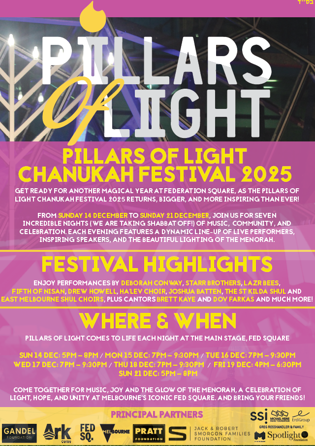 Pillars of Light is a multicultural and multi-faith celebration of Chanukah, focused on highlighting our shared humanity and celebrating the differences that bring together all of Victoria’s diverse communities.